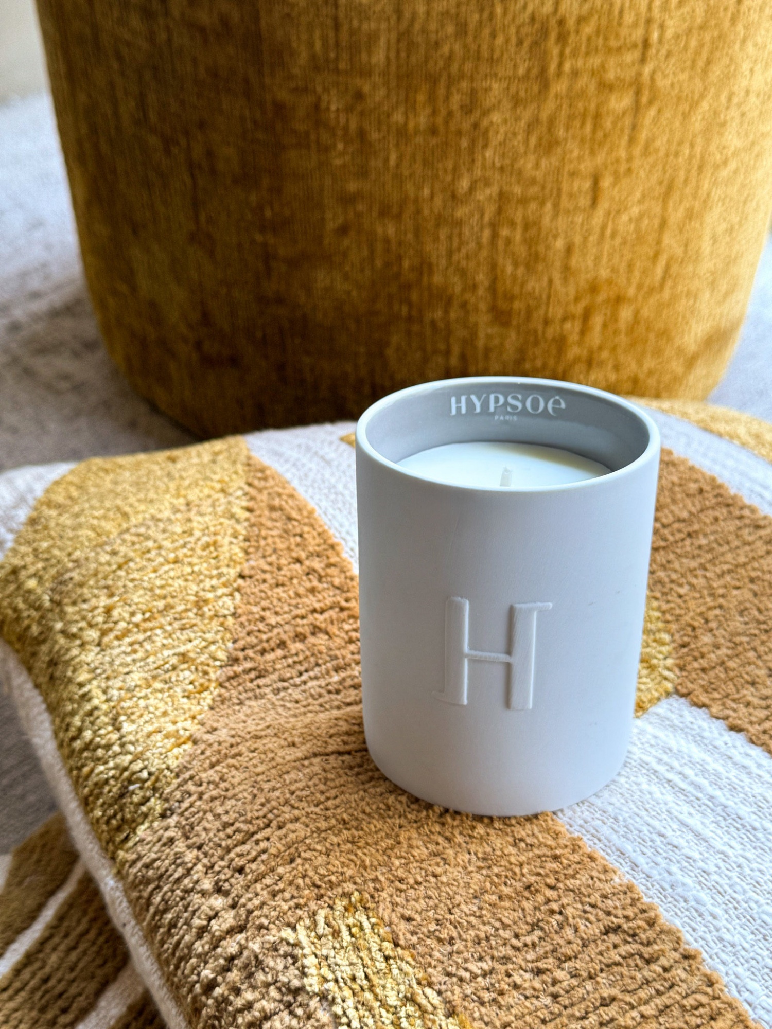 Bougie en céramique, H gravé, intérieur coloré. Cire végétale (et vegan). Mèche coton sans plomb. Durée : 45h environ. Contenance : 240g.