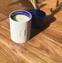 Ceramic candle, engraved H, coloured interior. Vegetable wax (and vegan). Lead-free cotton wick. Lasts for about 45 hours. Capacity: 240g.